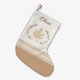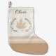 This neutral Christmas stocking blends soft oatmeal, taupe, and ivory with a stylized leaf-and-star band across the center. A cocoa name accent sits beneath the top seam. Its calm palette suits layered mantle décor and adds a subtle seasonal detail to winter home styling.