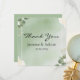 These wedding thank you cards showcase a soft sage green watercolor backdrop framed by a delicate double white border and accented with gentle eucalyptus sprigs and tiny blossoms for a romantic, nature-inspired finish. The airy, uncluttered center leaves plenty of room for your heartfelt message while coordinating beautifully with your matching invitations, save the dates, and other stationery pieces for a cohesive, elegant suite.