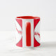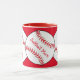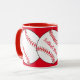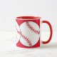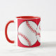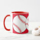 Mugg har röda och vita softbullar omgivna av röd bakgrund. Texten lyder: Softball Mamma. Anpassa enkelt texten för en speciell sportfantast eller ta bort den helt och hållet. Underbar för Mors dag eller någon gång på året.