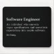 Denna humoristiska musknapp definierar vad en software ingenjör är: "En individ som omvandlar vaga specifikationer och orealistiska förväntningar till användbar software."