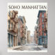 SoHo akvarell konstverk som visar ikoniska byggnader med gjutjärnsfasad, höga välvda fönster, brandstegar och kullersten gator i mjuka nyanser av dämpade gråa, varma stentoner och subtila industriella blåtoner. Kompositionen framhäver SoHo:s konstnärliga, stilrena och historiska karaktär, med betoning på dess unika arkitektur och kreativa energi utan att inkludera människor eller butiksvarumärken.