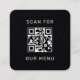 Den moderna och minimala utformningen av svartvita kvadratiska affärskort skapat för en restaurang eller pub har anpassningsbarnas QR-kod som kommer att vägleda kunderna till "Sök efter vår meny". Kortets baksida innehåller en logotyp och anpassningsbar som kan vara personlig med namn, webbplats eller plats för företaget. Alla formuleringar kan anpassas så att de kostymer företagets behov. Systemet med svart och vitt färg kan också ändras.