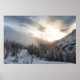 Vackra vinterlandskap med sol som lyser bakom berget genom molnen på ett snövinter.