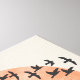 En flock med fåglar som är silhuetterade framför ett rödaktigt sol på en beige bakgrund.