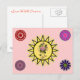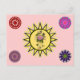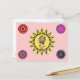 gula sol med triangulära balkar i mitten och innanför det en underbar gult kor med stor rosa blomma och grönt löv runt omkring den. På de fyra hörnen ett fyra vackra mandalas. en shock rosa mandala. en purpke och grönt mandala. en purpkle och mauve mandala och en röd och vit mandala. rosa bakgrund.