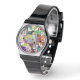 Den här klockan har en abstrakt design som består av nio fyrkanter med en cirkel och "strålar" som kommer ut ur cirkeln i många olika färg.
