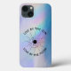 Regnbågsfologramkonstruktionen överlagrad på lätt lila böjd folie. Ett utkast från måne och sol omges av frasen Levande vid Sol och Kärlek vid Måne.