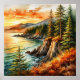 Livfull akvarellmålning av en skogbeklädd kustlinje med höga träd och klippiga klippor, badad i varma nyanser av den nedgående solen, som omfamnar naturens lugna skönhet och havets stillhet.