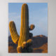 Solbelyst saguaro-kaktus mot blå himmel och låg bergskedja i Arizonas öken. Fotograferad vid Sabino Canyon, Tucson, Arizona