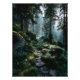 Gyllen solljus strömmar genom höga, ständigt gröna trädtak och lyser upp en slingrande stig av sten som täcks av mjuk moss och spridda stenar. Dimma driver försiktigt bland ormbunkar och trädstammar och sprider de varma strålarna i ett drömlikt, nästan heligt sken. Kompositionen utstrålar djup lugn, tidlös enslighet, skön förnyelse, den tysta magin hos orörd vildmark och kallelsen att stiga djupare in i naturens famn – perfekt för meditationsrum, sovrum, hemmakontor, terapirum, naturinspirerade vardagsrum eller som själsligt lugnande gåvor till vandrare, de som söker mindfulness, skogsälskare eller någon som längtar efter frid, jordning
