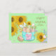 Välkomnar vår glädjen med detta vykort för söt Glad påsk med blek grönt bakgrund med rosa stänk, vackra solblommor till det översta lämnat hörnet, en mindre grund och en höger blå söt av basket och blommor. Baksidan är tom för att du ska kunna skriva ditt eget meddelande och mottagarinformationen om adress. Anpassa enkelt till din familj namn på framsidan.