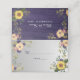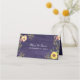 Elegant, modernt, land, botaniskt rustiskt lila bröllop-platskort med namn och bordsnummer, vattenfärgblommor, solblommor och grönska.