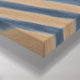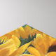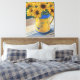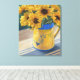 Oljemålning av solblommor i en gult och blå pitcher på en blå strippad bord-springer.