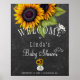 Rustic elegant fall babydusch välkomstskylt poster mall på mörk grått-kalkbrädet med klasar av solblommor från gult guld, burk, vita blommor och små hjärtan. Du kan välja att anpassa det ytterligare genom att ändra typsnitt och färg på text. — Perfekt för en chic snyggt Rustig trädgård | Höstsommarhösten | Bebisduschen party på landsbygden.