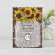 Sommar- eller fallträdgårdsbröllopsinbjudan med en vacker orange av gult solblommor bouquet, en stor genomskinlig mynning burk och band av tinkle ljus på en mörk av bruna lingelträ. Inbjudan lämpar sig för trädgårdsbakgård utomhus/land/sommarnatt eller höstgård, bröllop, par duschar, förlovningsfester eller grillar.