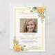 Den här inbjudan innehåller en elegant guldblommor och ram med den avlidne älskades foto i mitten. Anpassa inbjudan och ersätt fotot på din älskade och information om begravnings-/minnestjänsten. Du kan anpassa inbjudan på vilket sätt du vill minnas och hedra minnet av din älskade. Observera: "För alltid i våra hjärtan" kan solblommorna grön golden ram och annat grafiskt inslag och annat grafiskt konstnärligt verk inte redigeras, ändras, tas bort eller flyttat. De är fixerade.