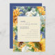 Moderna solblommor och koboltblå Inbjudningskort för möhippan. Foliage. Blå bakgrund.