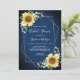 Inbjudningskort för möhippa har en blommigt med vattenfärg solrosor och vita blommor med ett ram med ytans guld geometriska på en marin blå träkornbakgrund. Anpassa dem med din egen text. Besök vår butik för att se vilket sortiment av matchande produkter som du kan anpassa till bröllop.