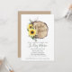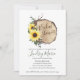 Ljusgula solblommor och botaniska bladvattenfärger inbjudningskort för möhippan. Boho rustic inbjudningskort för möhippan med en bukett av vackra solblommor runt en log kor-sektion.