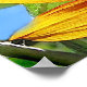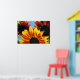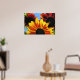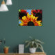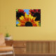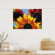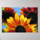Den här poster kommer att ge dig ljusstyrka och glädje! Tre ljusstarka solrosor av färgad belyses genom solskenan genom petalerna. Blommorna visningar en underbar palett av guld, gult, orange, rött och brunt. Grönt löv och blå himmel kompletterar denna sammansättning av färg och form.