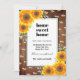 En rustisk brunfärgad lada i trä som bakgrund som dekoreras med vattenfärgade solblommor och lycklig som leker humla. Med texten: Home Sweet Home. Anpassa och lägg till din ny adress och namn.