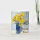 En blommigt "Tack" Notecard med gyllene solblommor i ett högt blått vas, från en originalmålning av oljepastel av Judy Adamson. Sättet är i rostbrunt.