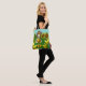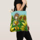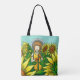 En flicka i en fält av solblommor på en varm sommareftermiddag.