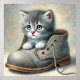 Den här teckningen skildrar en hjärtslitande scen med fluffy grått-kattunge innesluten i en utsliten lädersko. Kattens stora, blå ögon verkar ha en nyfikenhet och kanske en aning ensamhet. Kontrasten mellan den lilla kattungen och den stora skon skapar en känsla av och ökar bildens charm.