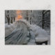 Vintermorgonens filmvykort. Vägfoto i land täckt av snö, som togs tidigt på morgonen och tittar upp backe, där sol ligger utanför en dräneringsväg täckt av snö.