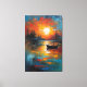 A bold, expressive oil painting capturing a lone boat adrift on tranquil waters beneath a blazing sunset. Fiery oranges and deep blues collide in the sky and mirror perfectly on the water’s surface, creating a dreamlike, abstracted reflection. Silhouetted masts and distant structures fade into the horizon, evoking mystery and quiet contemplation. Rendered with thick impasto brushwork, this piece pulses with emotion and color — ideal for modern interiors seeking dramatic, soulful art.