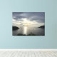Ett foto som fångar det vackra i en solnedgång över havet, när dagens sista strålar försiktigt tonade under horisonten. En ljusbryggning skapar att skrynklas på vatten och reflekterar den slutliga strålen av solljus. Dagens fredliga stillhet förs genom