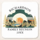 Skapa anpassningsbar-familjens återförening underlägg för ditt campingtemaparty. Utformningen har ett solnedgångslandskap med bergsområden och gräs träd och sjö på vit vintage. Skriv in din familj namn och år via mallen för att anpassa underläggen.
