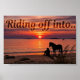 Fånga den klassiska, romantiska drömmen om att rida iväg mot solnedgången. Denna vackra affisch visar silhuetten av en person som sitter på en strand bredvid sin häst, med texten "Riding off into..." ovanför dem i ett graciöst typsnitt. Bakgrunden är en spektakulär solnedgång över vattnet, med en perfekt spegelblank reflektion. Detta tryck är en perfekt present till hästälskare, drömmare och alla som uppskattar en touch av västerländsk romantik och naturlig skönhet.