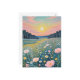 Den här teckningen fångar upp ett gott och mystiskt landskap vid solnedgången, med en drömliknande kvalitet som blandar detaljerade naturliga former med en andlig, eterisk atmosfär. Förgrundsbilden är en levande ängsskugga fylld med mjuka, pastellpräglade färgader och vilda blommor, som var och en återges med en delikat, stiliserad beröring. En väg eller ström med lindning leder öga in i avstånd, där en mörk, en stillastående skog hugger horisonten under ett stort himmel som målas i en strålande gradient av rosa, persika och teal. En blek, fullt eller måne hänger i himmel och kastar en mild glöd över hela scenen. Biet väcker en känsla av fred, förtjusning och naturens tysta skönhet.