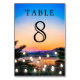 Elegantens bordsnummer-kort med modern typografi mot en romantisk solnedgång.