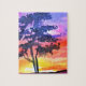 Vackra färgstarka landskapets solnedgångande målning av konstnären Sacha Grossel av ett rött gult och lila solnedgångslandskap i utsidan med en skugga i träd i förgrunden. Färgfull originalgrafik i vattenfärgen stil.