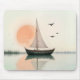 En segelbåt går i stor utsträckning i lugn vatten med stor orange sol i bakgrunden och fåglar som flyger i närheten
