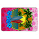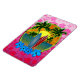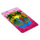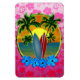 Vackra strandsolnedgångar bakom surfbrädor och handflatan träd, inramade med bambu- och hibiscus-blommor.Med rosa bakgrund av Hawaiian Honu Sea Turtles och hibiscus-blommor.