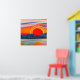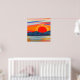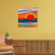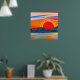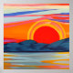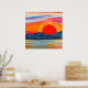 Poster i ett halvabstrakt havsolnedgång bakom ett bergsområde, i det psykedeliska färgen av eldröd och orange, med mörk indigo blå berg