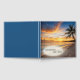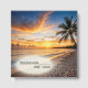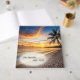 En serenstrandscen har en fantastisk solnedgång, med vibrerande orange och blå nyanser som målar himmel som en skonsam vinkarare kyss sandstranden för en minnesstund eller begravning. All text kan ändras.