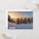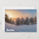 Vy över frusen snöskog med täckt beslag i snö, grisen och gräs träd på havs-kusten...