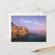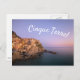 Fotovykort från lila himlar vid solnedgången över den vackra byn Manarola, byggt på sten ovanför Medelhavet vid kusten i Cinque Terre-området i Ligurien, Italien med den något böjda texten "Cinque Terre!" i vitt.