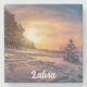 Panoramisk syn på solnedgången över vinterlandskapet med täckt yta i snö gräs och i träd mot dramatiskt kvällsljus. Snowy Baltic Sea kusten