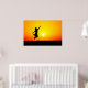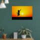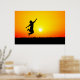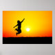 En flicka som hoppar upp i luft ovanpå backe framför ett rött solnedgång i blodet