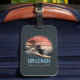 Sunset Wave-Riding Cat Luggage Tag: En svart katt som surfar på en våg, med sol i skuggor av rosa och orange, skapande en viskisk och surrealistisk scen.
