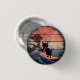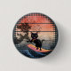 Sunset Wave-Riding Cat 1 Inch Round Button: En svart katt surfande på en våg, med sol i skuggor av rosa och orange, som skapar en viskartad och surrealistisk scen.
