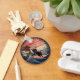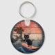 Sunset Wave-Riding Cat-nyckelkedja: En svart katt som surfar på en våg, där sol sätter sig i skuggor av rosa och orange och skapar en viskisk och surrealistisk scen.
