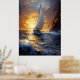 Lägg till elegans i dina väggar med det här slimmade sjölandskapet. Med en segelbåt som seglar genom gyllene vinkara under en glödande horisont är denna imponerande konsttryckning perfekt för havets älskare och alla som söker sofistikerad hemdekoration.