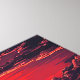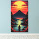 En ensam silhuett står vid en glittrande flod, vänd mot en hög vulkan under en dramatisk röd-orange solnedgång. Levande röda löv ramar in scenen och blandar naturens kraft med en lugn, surrealistisk skönhet.