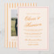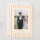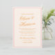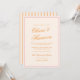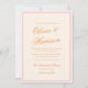 Solnedgångsglöd bröllopsinbjudan för ett estetiskt sommarbröllop, en vacker varm retro-moderndesign för par som älskar mjuk preppy stil och polerad typografi. Med orange och rosa på en krämvit bakgrund blandar denna sommar-solnedgångsbröllopsinbjudan varma solnedgångspalettfärger, aprikosknuff energi och en modern randdesign för en fräsch men tidlös firande.
